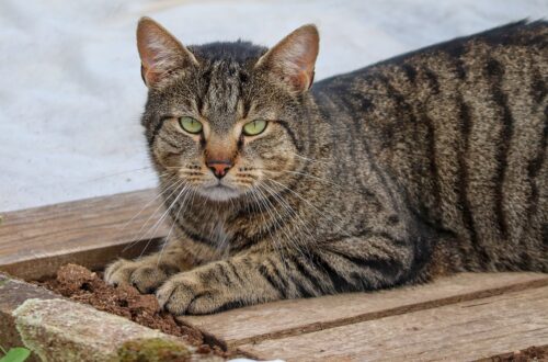 Lille leopard-kat, brun og sort. Hun er lidt sky men glad for menneskekontakt. Chippet med et lille c i bege ører.