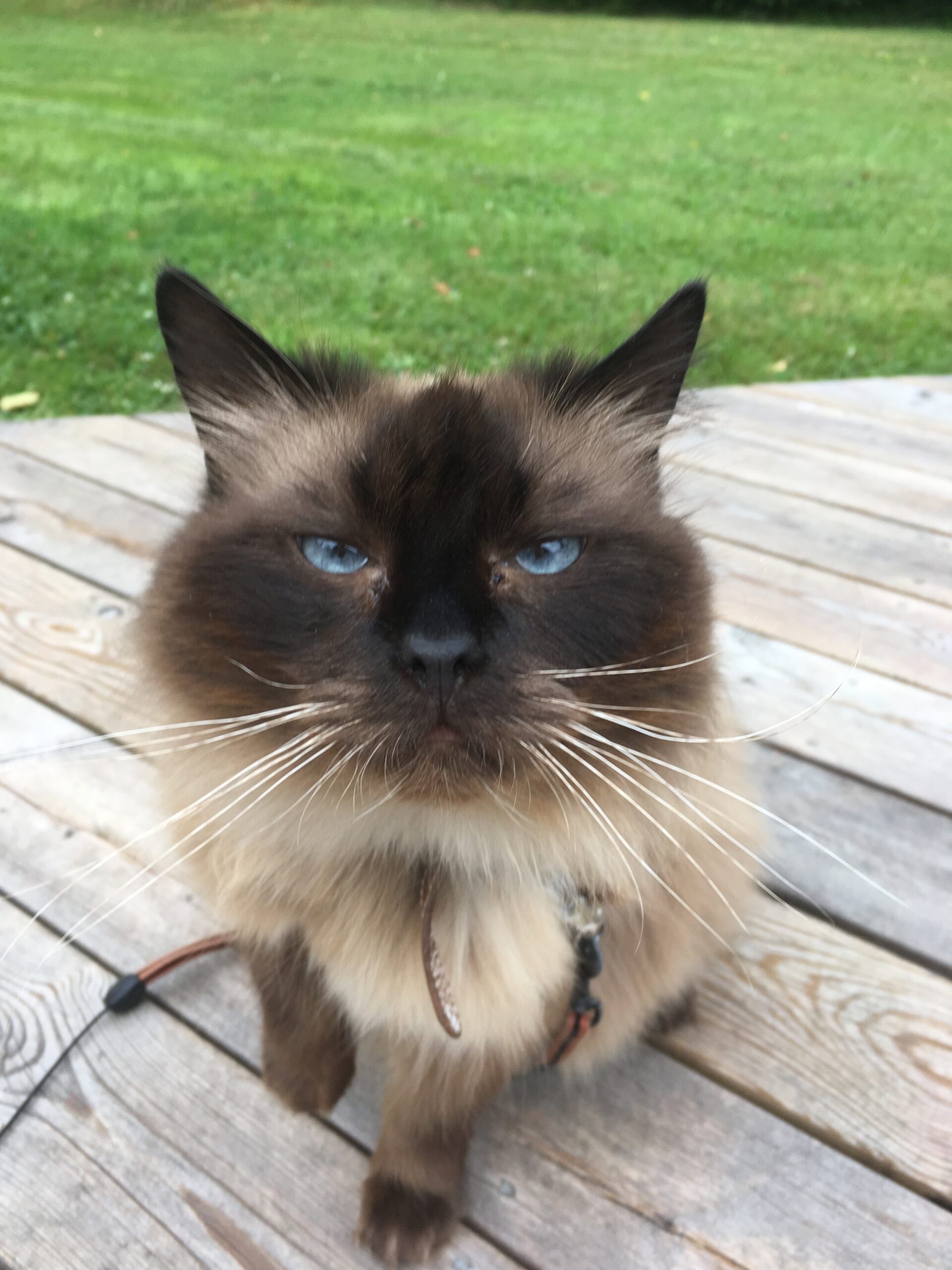 Hun er en brunmasket Ragdoll, med mørke poter og hale. Hun er cremefarvet på bryst og mave, og brunlig på ryggen. Derudover har hun blå øjne.