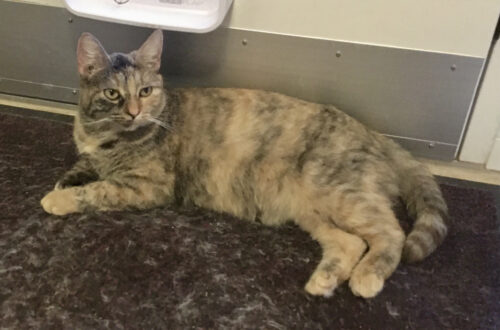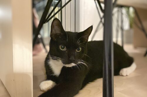 Den er sort med hvidt bryst og poter . Halsbånd med klokke og øretatovering er i katteregistret.