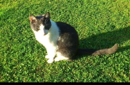 Han er en stor killing på cirka 1 år og meget kærlig og kontaktsøgende. Som I kan se på billedet har han helt sort hoved med et stort hvidt område på bryst samt hvide sokker og en karakteristisk hvid plet på højre bagben. Han er både øremærket (VBM030) og chippet, men har ikke halsbånd på.