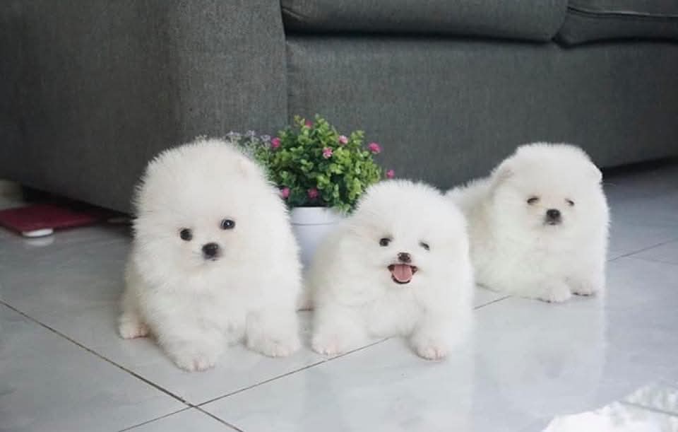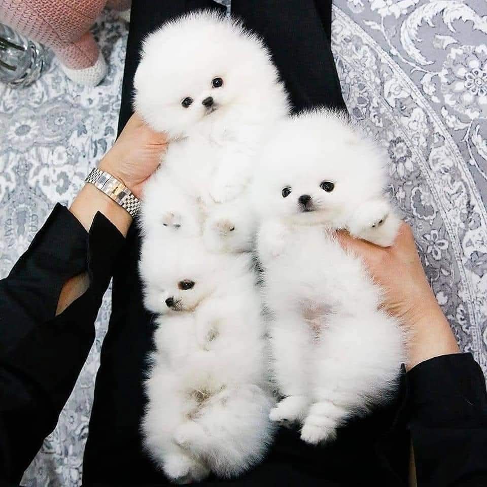 Vi tilbyder fem smukke hvide Pomeranian-hvalpe.