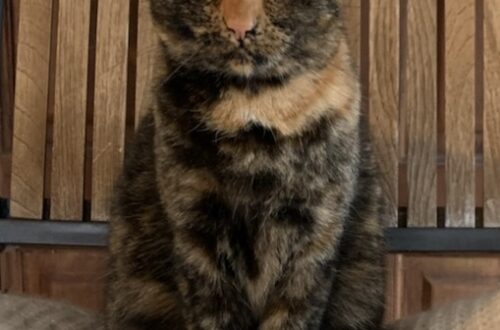 Hun er sort og hvid og har gulde øjne.