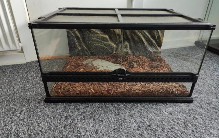 Terrarium 1: Hjemmelavet, 100x51x40 Terrarium 2: Exo Terra, 60x45x32 Medfølger: Varmeplade, vandskål, pynt og skjule muligheder.