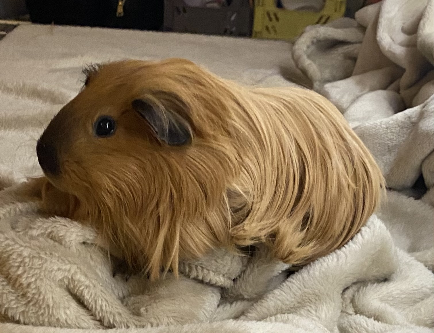 Marsvineunge på 1/2 år er desværre blevet alene. Han er ikke kastreret. Han er langhåret. Hans bur, hø hæk, mad skål og drikke flaske kan medfølge.