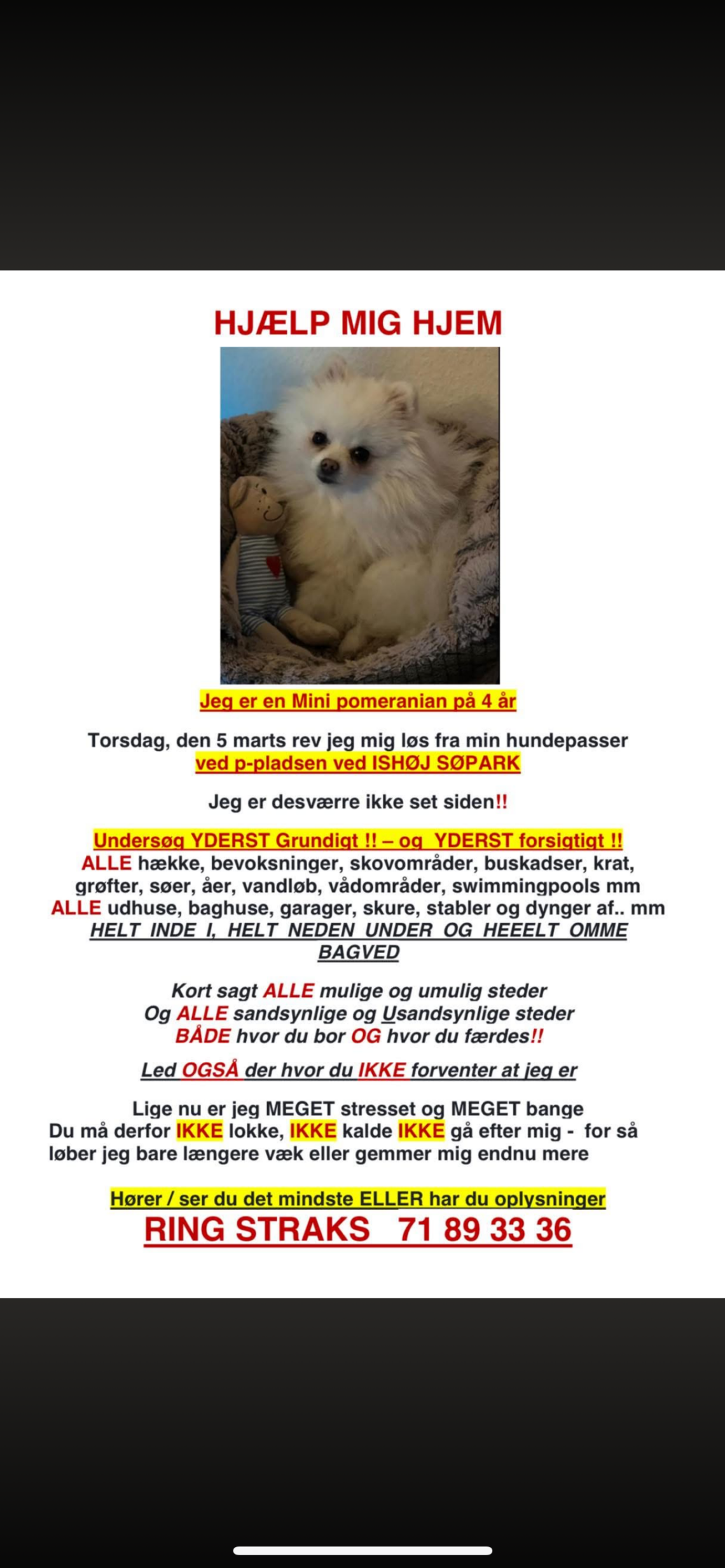 Min hund (Mini Pomeranian) forsvandt fra Ishøj Søpark den 5. marts. Han er mikrochipmærket og registreret i Hunderegisteret (registreret efter han forsvandt). Han har ikke halsbånd på. Hvis du har set ham, eller hvis han blev taget til dyrlæge før registreringen, så tjek venligst igen og giv os besked.