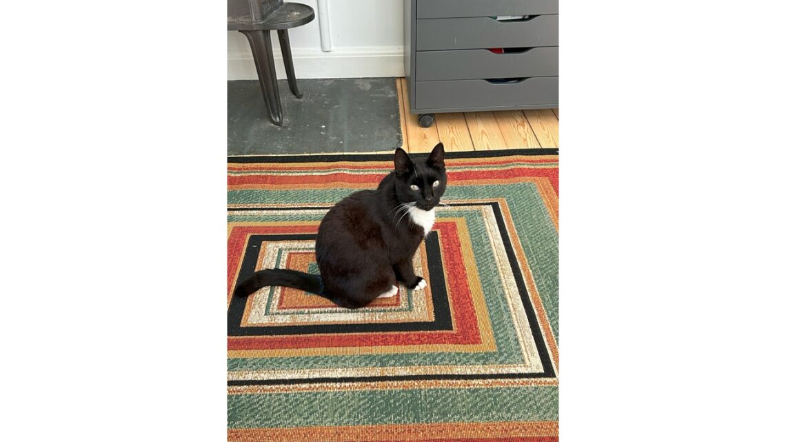Sort kastreret hankat i ‘smoking’ med stort hvidt bryst. Gule øjne. Mgl. halespidsen.