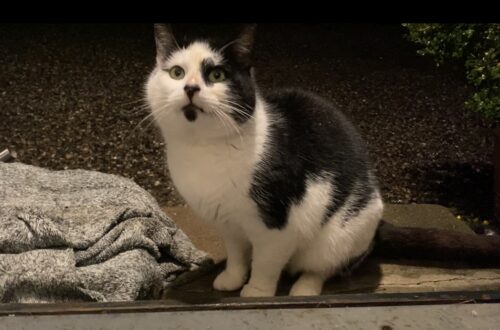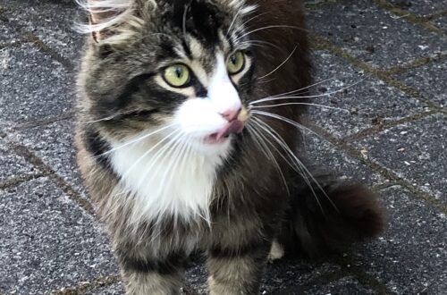 Stribet: brun, grå, sort, rød hvid, m hvidt på poter og bryst.