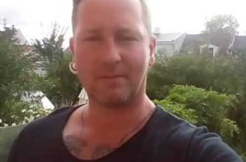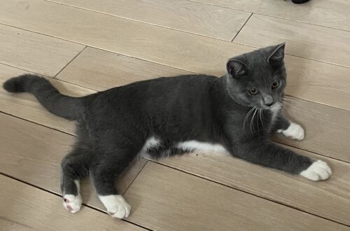 Han er 6 år gammel og kastreret, grå med sorte pletter -(ikke rød) har en smule lysebrun under hagen og næse og hvide sko på de 4 poter – ingen støvler.