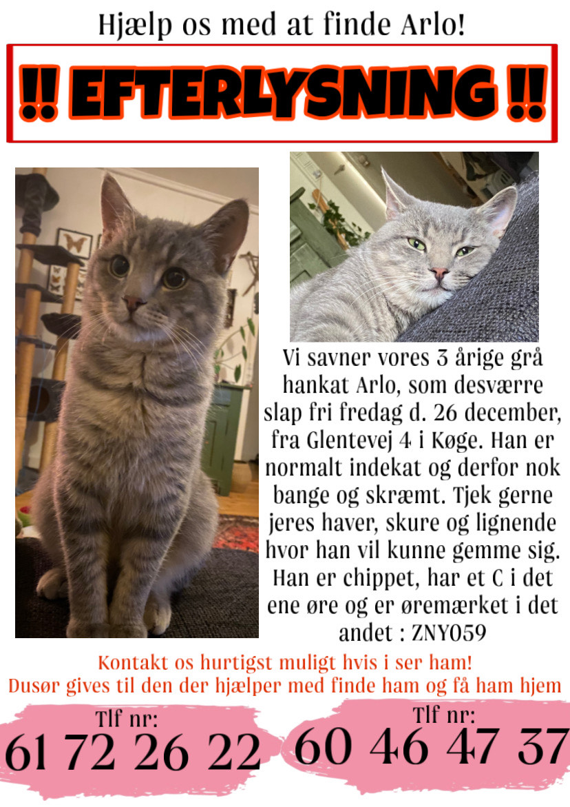 Vi savner vores elskede Arlo, som desværre flygtede i ren panik d 26 december fra Glentevej 4 i Køge. Han er normalt indendørs kat, så han er nok skræmt, usikker og overhovedet ikke kendt i området. Han er chippet + har et C i det ene øre, og en øretatovering som er : ZNY059. VI savner ham meget, og er bekymrede. Kontakt os endelig ved det mindste, dusør gives til den der får ham hjem igen.