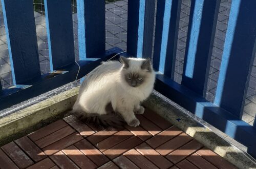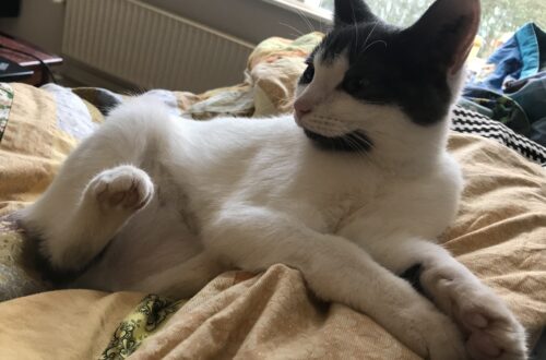 Karla er trefarvet med hvid mave og hvide “sko”. Hun bærer evt. Lilla halsbånd til kattelem, samt hun er øremærket.