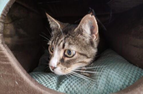 Han er kastreret og øremærket. Han er 1,5 år og vejer ca 7 kg.