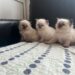 og bærer et gråt/blåt loppe halsbånd.